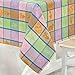 STYLING: The Home Bargains Plus Bunny Jubilee Easter Patchwork Woven Plaid Cotton Tablecloth features a pastel colored patchwork checkerboard weave with various boxes with Easter Bunnies, Spring Blooms and Decorated Easter Eggs in shades lime green, peach, pink and lavender with blue egg striped borders.