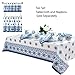 STYLING: The Mykonos tablecloth features a medium and small scale medallion tile print border with a solid stripe band separating an all-over medallion print on the center body finished with a double striped border all in a rich Aegean Sea Blue on a crisp white background. background.