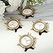 Order over $39 eligible for FREE SHIPPING,combine with any Efavormart itemsQuantity: 4 Mini Photo Frames Material: Resin Color: Gold Frame Style: Ship Wheel Overall Size: 3.5"L x 3"W Photos Size: 1.75" Dia. Number Of Spokes: 6 Features: Sturdy, Durable, Portable and Lightweight They are equipped with backing to fit your favorite photos Easel on the back for the frame to stand on it's own Multi-Use: Picture Frame, Place Card Holder, Photography Prop and more!