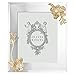 Gold finished cast pewter contemporary pattern with hand-set clear European crystals. Elegant champagne hued moiré silk back with easel designed for vertical or horizontal placement.