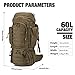 60L Large Capacity ; 13.8" W x 25.6" H x 9.8" D ; Made High-intensity military-style 1000D Nylon ripstop fabric, scratch-resistant , which wear-resistance is higher than conventional polyester fabric,not easy to fade after long-term use.