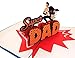 This Super Dad 3D Pop Up card is 5 inches wide by 7 inches tall. It comes with one envelope and a protective cello clear bag to give as a gift or mailing.