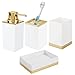 4 PIECE SET: Includes a tall soap pump - fill with your favorite liquid soap solution or hand sanitizer; It is easy to refill, just unscrew the top - the wide mouth makes refills easy; The tumbler cup is perfect when you need a drink of water, a rinse after brushing or use it to contain large toothpaste tubes and spin toothbrushes; The divided toothbrush stand has 3 sections to keep toothbrushes secure; The soap dish has ridges to keep water away and extend the life of your soap