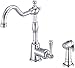 BRIDGE KITCHEN FAUCET – Features clean traditional design with decorative handles; high arc spout for added clearance and reach; includes decorative side sprayer in coordinating finish