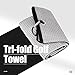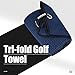 TOWEL:Tri-fold Microfiber with waffle design removes dirt, mud, sand and grass better than cotton towels. Size 16” x 21” with a heavy duty aluminum clip/carabiner that conveniently attaches to your golf bag.