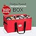 [STORE - SPACE SAVING DESIGN] The storage container comes in 2 colors: red and gray and measures 25" W x 12.8" H x 13" D. A clear identification card slot is positioned in front so you can label your ornaments and keep them organized. Box collapses flat when not in use and can be stored anywhere. Durable handles allow you to comfortably carry your container from room to room.