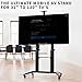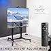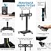 FLEXIBLE VIEWING - PORTRAIT OR LANDSCAPE: You can easily adjust this rolling TV stand’s height from 47 to 65 inches and tilt the display +5 degrees to -10 degrees to achieve optimal viewing angles. This unit features two shelves, one mounted above the display, which can hold projectors, webcams and laptops, and a lower shelf that can hold audio/video devices.