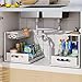 An easy-to-use design: the lower shelf of the under sink cabinet organizer slides for easy access, while the upper shelf with enlarged sides keeps your kitchen and bathroom essentials secure; our under the sink storage organizer is universal and can be used either like bathroom organizers or cleaning products organizer; keep everything without mess and enjoy comfort and safety