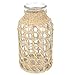 This boho-inspired vase features recycled hurricane glass wrapped in intricately hand-woven rattan
