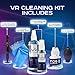 FULLY EQUIPPED: UltraVue VR Tech Cleaning Kit includes: 1 x 8oz and 1 x 2oz VR Cleaner gel spray bottle, 3 x microfiber cloth (12"x15", dark blue), 2 x Fog Stopper drops treatment, 1 x brush, 1 x air bladder with precision nozzle.