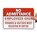 GIVE A MESSAGE. Use this Employees Only - Vendors And Visitors Must Register At Main Office sign to mark the entrance that can be accessed by employees only.