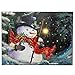 CHRISTMAS CANVAS. Colorful snowman in the night sky. White snowman with a black top hat and red scarf. Cute, fat snowman sitting a field holding a Lantern that is lit up. This print has 1 LED light and 20 fibers embedded in the canvas.