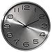 Modern metal pendulum clock with black wooden veneer with silver colored accents; quartz crystal movement allows for the most accurate time keeping