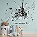 Featured with a fantasy fairy tale castle, it says never grow up, there are many magic characters like little peter pan tinker bell Aladdin dumbo deer beside the castle