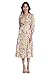 V-neck, 3/4 puff sleeves with button at cuffs, empire waist band with sash fabric tie at back, and midi length skirt.