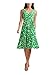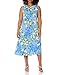 Jewel neck with pleat tuck and center front keyhole details, sleeveless, empire waist, fit and flare body, and below the knee skirt.