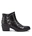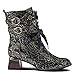 L'Artiste Style: Originala Pop Art metallic suede printed swirls contrast against the black suede background of our military-inspired inside zipped ankle buckling boot. Featuring antique brass lucky horseshoe buckle and filigree button embellishments, dimensional applique flowers, a shiny striated chunky pewter trimmed heel and a silver studded welt sole. Comes with matching ribbon laces, paisley printed velvet lining and padded footbed for all day dreamy comfort.