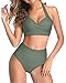 Olive green retro top with high waist bottoms plus size bathing suits makes you look amazing during a beach vacation, swimming pool, or honeymooning in Hawaii, etc.