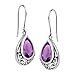 These teardrop-shaped earrings boast two pear-cut amethysts bezel-set in intricately detailed sterling silver. Earrings measure 1 9/16 by 5/8 inches and feature French wire back findings. Pieces come with “.925” sterling silver quality stamps as symbols of guaranteed product quality.