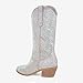 This sparkly cowgirl boot has 2.36" stacked heel, 12.2" shaft height and 12.99" calf and top circumference.