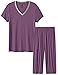 【Feature】Comfort and style come together perfectly with this pjs that has contrast color trimmed at the hem, cuff. Each sleepwear set includes a short-sleeved v neck pullover and a pair of capri pants for comfort. And the pant is designed with an elastic waistband.