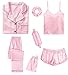 【Package Including】--- 7 Pcs Women Silk Satin Pajamas Set included: Camisole Top*1, Cute Shorts*1, Short Sleeve Shirt*1, Long Pant*1, Hair band*1, Eye mask*1, Pajamas Storage bag*1