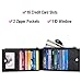 Large Storage Space and Zipper Protection: Double zipper compartments, one for credit cards or cash, one for coins or cash. 12 separate credit card slots, each card slot can hold 1 or 2 cards, 4 cash slots, can store coins or folded banknotes, and 1 ID window.