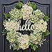 QUNWREATH spring summer wreath, natural grapevine wreath, green colored hydrangea and green plants, full of spring's breath. The "Hello" on the wreath is a greeting to you, and also a perfect welcome sign for neighbors, relatives and friends.
