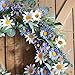 Artificial wreath: Blue and white daisies in this colourful wreath. There are also many green leaves and small flowers, which make the wreath look very real and colorful.