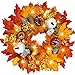 Lighted Fall Wreath: Our 14 inch artificial Autumn maple leaf wreaths with 3 pcs pumpkins, 3 pcs acorns and maple leaves range from vibrant yellow to orange. Extra bonus 12" metal hanger for your convenience. Hanging it on the front door, living room, fireplace, cabinets, walls, windows, outdoor covered porch or any other places to welcome your guests and create a romantic atmosphere