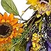 FRONT DOOR WREATH measures 22" in diameter and is decorated with sunflowers, green foliage, yellow, orange, and purple blossoms and twigs. Lightly dust when needed. Shaping is required to achieve a full and life like look upon delivery.